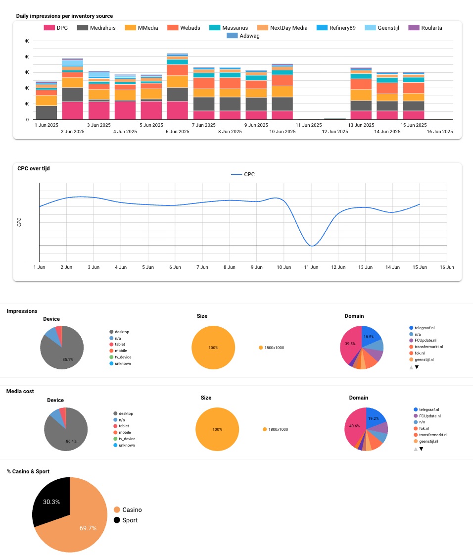 Van de prestaties per uiting tot realtime views op banners, en van campagne bereik tot de door jou vooraf gestelde KPI(‘s). Alles wat ertoe doet, op één plek. Jij bepaalt welke metrics je graag wil zien, wij bouwen het dashboard.